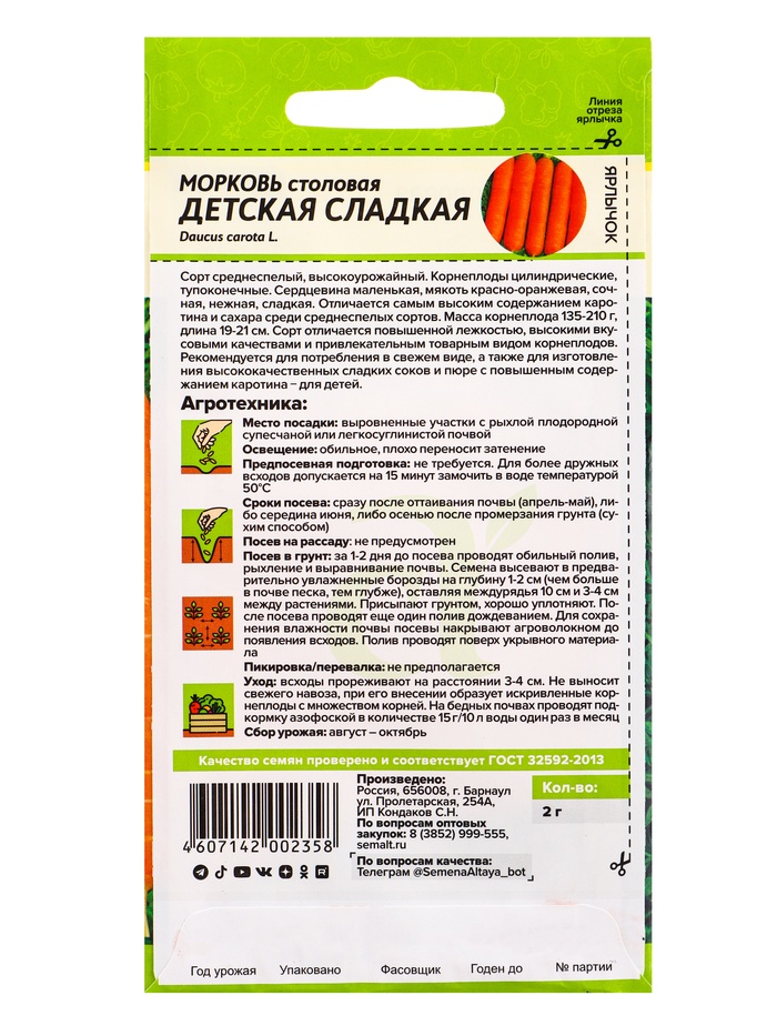 Семена Морковь «Детская сладкая», 2 г, «Семена Алтая»