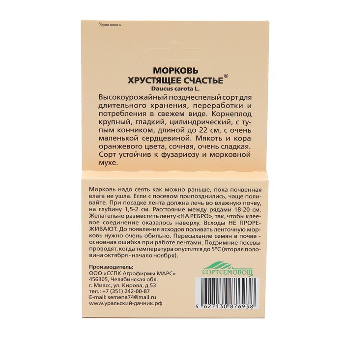 Высокоурожайный позднеспелый сорт для длительного хранения, переработки и потребления в свежем виде. Корнеплод крупный, гладкий, цилиндрический, с тупым кончиком, длиной до 22 см, с очень маленькой сердцевиной. Мякоть и кора оранжевого цвета, сочная, очень сладкая. Сорт устойчив к фузариозу и морковной мухе. Морковь надо сеять как можно раньше, пока почвенная влага не ушла. Если с посевом припозднились, чаще поливайте. При посадке лента должна лечь во влажную почву, на глубину 1,5-2 см. Расстояние между рядами 18-20 см. Желательно разместить ленту «НА РЕБРО», так, чтобы клеевое соединение оказалось наверху. Всходы НЕ ПРОРЕЖИВАЮТ. До появления всходов поливать ленточную морковь нужно очень обильно. Пересыхание семян в почве основная ошибка при работе лентами. Подзимние посевы проводят, когда температура опустится до 5°С (вторая половина октября-начало ноября).