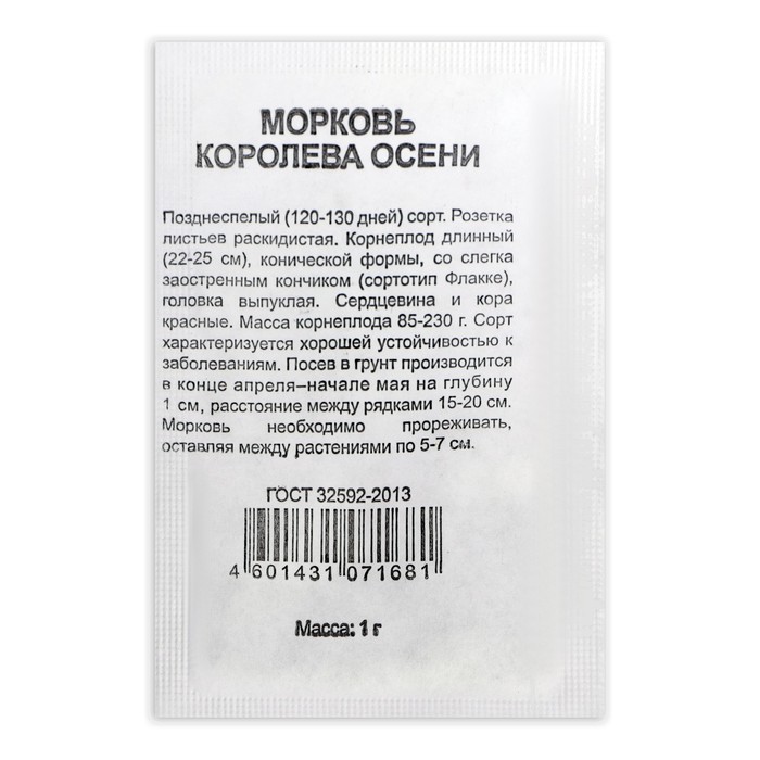 Позднеспелый (от всходов до технической спелости корнеплодов 120-130 дней) сорт. Корнеплоды конические, со слегка заостренным кончиком, длиной 20-25 см, массой 60-180 (до 250) г. Мякоть оранжево-красная, сочная, нежная, сладкая. Урожайность до 3,8-9 кг/м². Ценность сорта: устойчивость к растрескиванию и цветушности, дружное формирование и выравненность корнеплодов, пригодность для длительного хранения. Рекомендуется для употребления в свежем виде и всех видов переработки.
