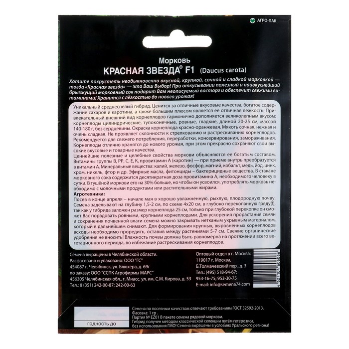 Рекомендуется для свежего потребления, переработки, консервирования, замораживания. Корнеплоды отлично хранятся до нового урожая, при этом прекрасно сохраняют свои высокие вкусовые и товарные качества.Ценнейшие полезные и целебные свойства моркови объясняются ее богатым составом. Витамины группы В, РР, С, Е, К, провитамин А (каротин) — при приеме внутрь преобразуется в витамин А. Минеральные вещества: калий, железо, фосфор, магний, кобальт, медь, йод, цинк, хром, никель, фтор и др. Эфирные масла, фитонциды – бактерицидные вещества. В стакане морковного сока содержится десятикратная доза провитамина А, необходимого человеку в сутки. В тушёной моркови его на 30% больше, но чтобы он усвоился, употреблять морковь не- обходимо с молочными продуктами или растительными жирами.