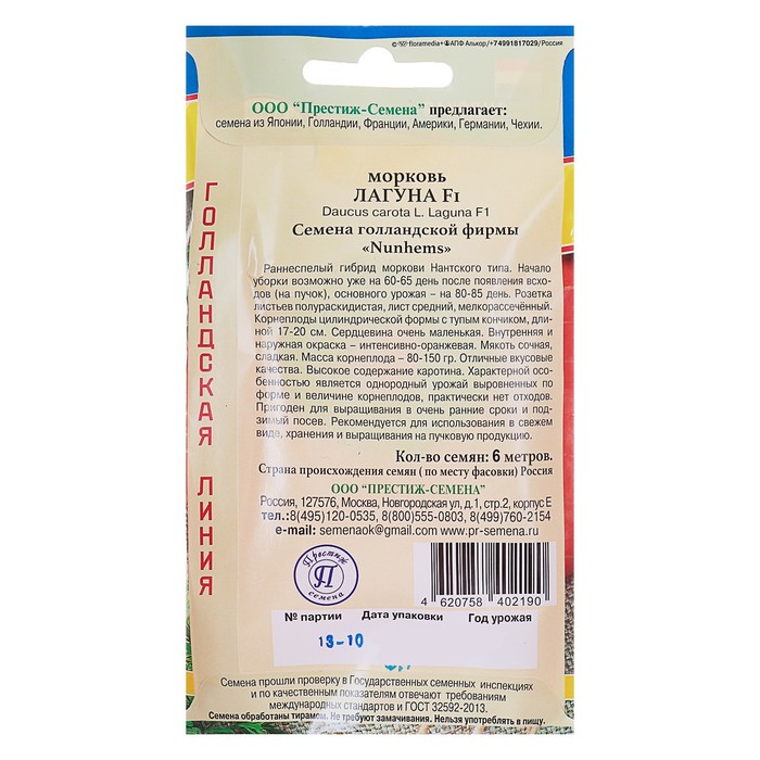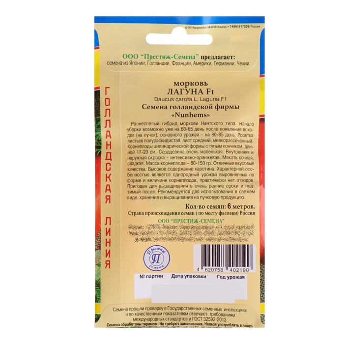 Новый гибрид раннеспелой моркови нантского типа. Характерной особенностью является однородный урожай выровненных по форме и величине корнеплодов. Отличные вкусовые качества. Высокое содержание каротина. Окраска сердцевины и мякоти — интенсивно-оранжевая. Сердцевина очень маленькая. Высокий урожай товарных корнеплодов практически нет отходов. Корнеплоды длиной 17—20 см, цилиндрические, ровные. Начало уборки возможно уже на 60—65 день после появления всходов (на пучок), 90 % урожая на 80—85 день. Пригодна для выращивания в очень ранние сроки и подзимний посев. Основные характеристики: раннеспелость однородность продукции продуктивность товарность корнеплодов вкусовые качества.
