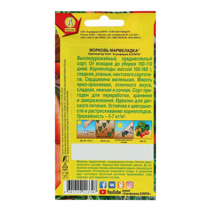 Высокоурожайный, среднеспелый сорт. От всходов до уборки 100-110 дней. Корнеплоды массой 100-160 г, гладкие, нантского сортотипа. Пригодны для переработки, хранения и замораживания. Идеальны для детского питания. Урожайность – 5-7 кг/м2. Сорт устойчив к цветушности и растрескиванию корнеплодов.