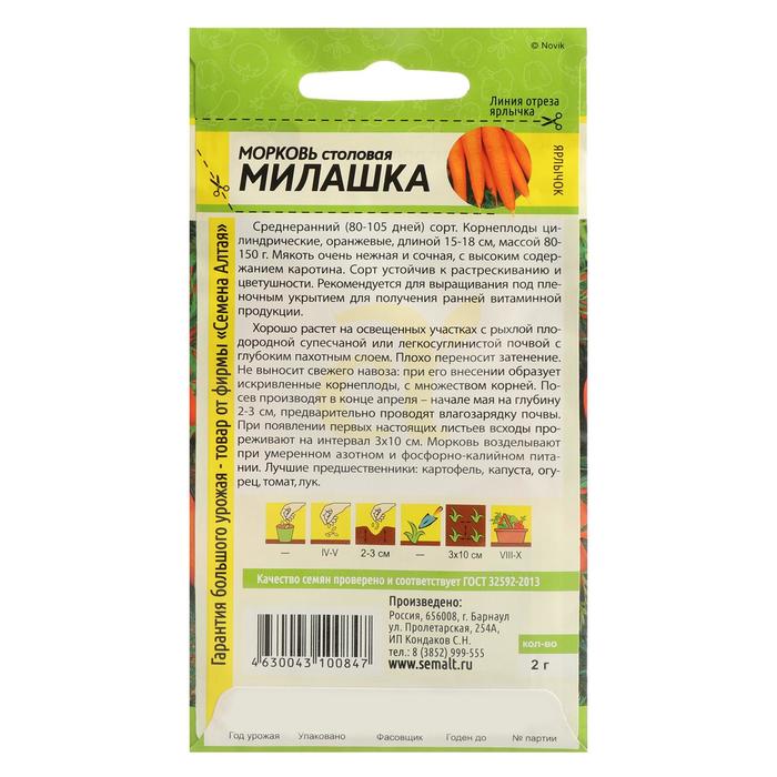 Среднеранний (80-105 дней) сорт. Корнеплоды цилиндрические, оранжевые, длиной 15-18 см, массой 80-150 г. Мякоть очень нежная и сочная, с высоким содержанием каротина. Сорт устойчив к растрескиванию и цветушности. Рекомендуется для выращивания под пленочным укрытием для получения ранней витаминной продукции. Хорошо растёт на освещённых участках с рыхлой плодородной супесчаной или легкосуглинистой почвой с глубоким пахотным слоем. Плохо переносит затенение. Не выносит свежего навоза: при его внесении образует искривленные корнеплоды, с множеством корней. Посев производят в конце апреля – начале мая на глубину 2-3 см, предварительно проводят влагозарядку почвы. При появлении первых настоящих листьев всходы прореживают на интервал 3х10 см. Морковь возделывают при умеренном азотном и фосфорно-калийном питании. Лучшие предшественники: картофель, капуста, огурец, томат, лук.