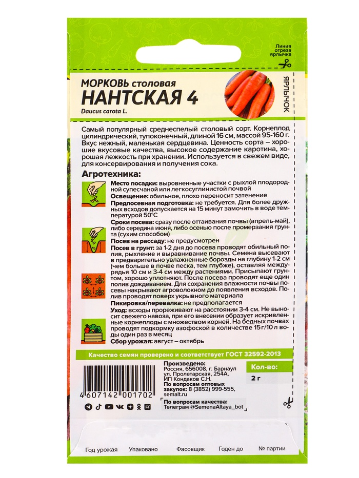 Семена Морковь «Нантская 4», 2 г, «Семена Алтая»
