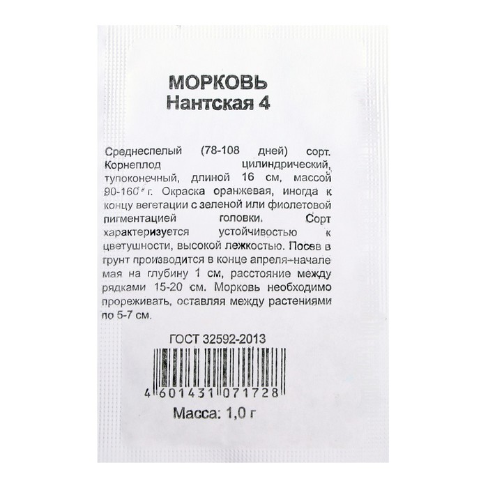 Среднеспелый (78-108 дня от всходов до технической спелости) сорт. Посев семян в грунт производится в конце апреля – начале мая на глубину 1 см, расстояние между рядками 15 см. Подросшие всходы прореживают, оставляя между растениями по 5-7 см. Розетка листьев полустоячая. Окраска корнеплода оранжевая, иногда к концу вегетации с зеленой или фиолетовой пигментацией головки, мякоть и сердцевина оранжевые, иногда светло-оранжевые. Корнеплод цилиндрический, тупоконечный, длиной 16 см, диаметром 4-5 см, массой 90-160 г. Сердцевина округлая и угловато-округлая. Поверхность гладкая. Корнеплод слегка приподнят над поверхностью почвы. Сорт характеризуется устойчивостью к цветушности, высокой лежкостью. Рекомендован для потребления в свежем виде, консервирования, замораживания и для зимнего хранения. Урожайность 2,5-6,6 кг/м2.