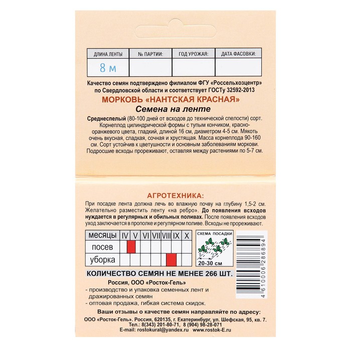Среднеспелый (80-100 дней от всходов до технической спелости) сорт. Корнеплод цилиндрической формы с тупым кончиком, красно-оранжевого цвета, гладкий, длиной 16 см, диаметром 4-5 см. Мякоть очень вкусная, сладкая, сочная и хрустящая. Масса корнеплода 90-160 см. Сорт устойчив к цветушности и основным заболеваниям моркови. Подросшие всходы прореживают, оставляя между растениями по 5-7 см.
