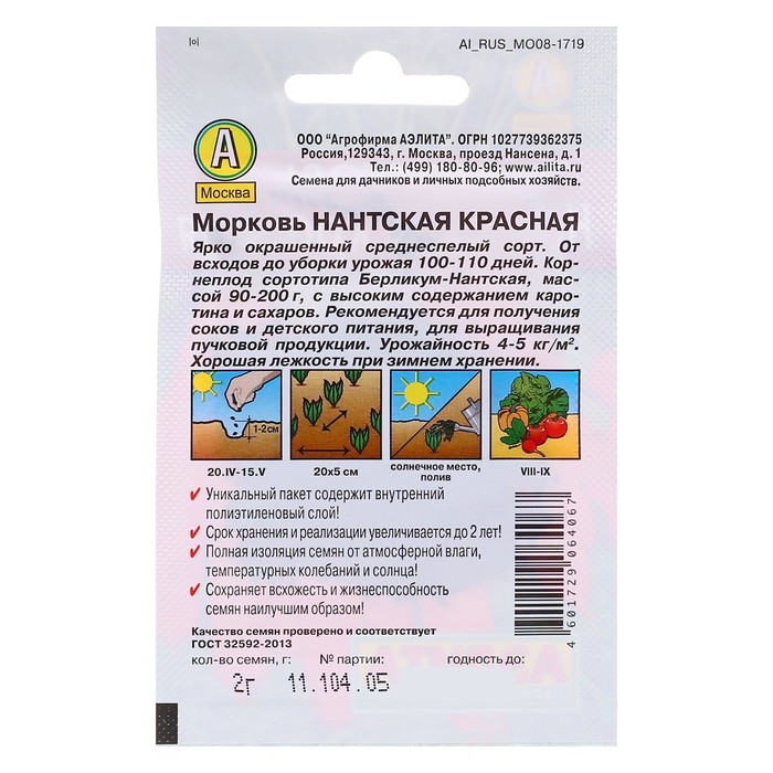 «Нантская красная» — это среднеспелый сорт моркови, у которого период от всходов до технической зрелости составляет 100–110 дней. Обладает устойчивостью к цветушности и высокой лёжкостью.