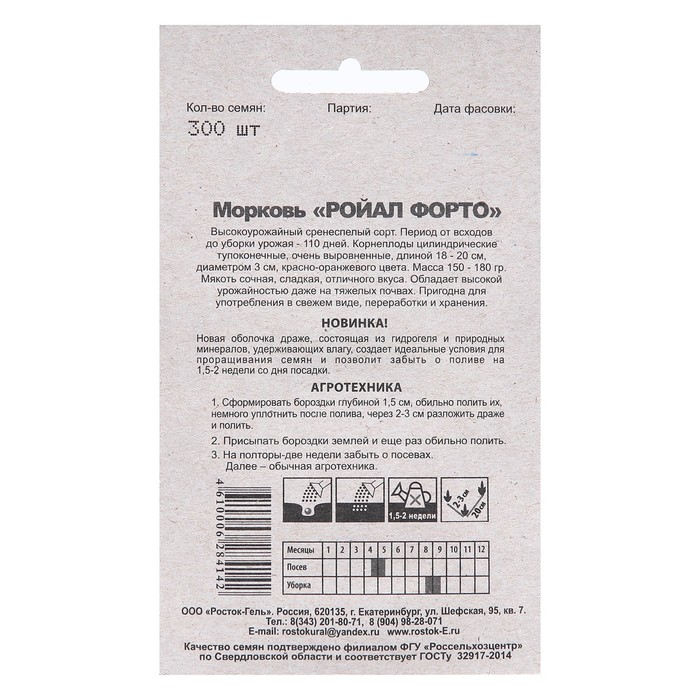 Среднепоздний (120–130 дней от всходов до технической спелости) высокоурожайный сорт для употребления в свежем виде. Корнеплод цилиндрической формы, с тупым кончиком (сортотип Нантская), оранжевый, длиной 18–20 см, средней ширины, диаметром 3 см, оранжевый, гладкий, практически без сердцевины. Мякоть оранжевая, сочная сладкая, с великолепным вкусом. Масса корнеплода 89–108 г. Урожайность 3,5–4,5 кг/м2. При летних посевах хорошо хранится. Посев семян в грунт производится в конце апреля–начале мая на глубину 1 см, расстояние между рядками 15 см. Подросшие всходы прореживают, оставляя между растениями по 5–7 см.