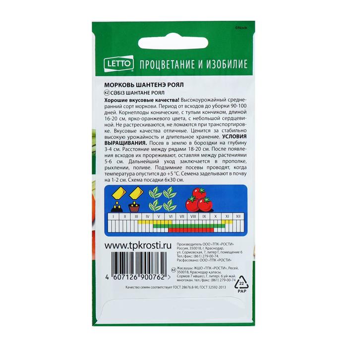 Семена моркови «Шантане Роял» — среднеранний высокоурожайный сорт для переработки, консервирования, заморозки и длительного хранения. Отличается повышенным содержанием каротина. Плод вырастают длиной около 16‒18 см.