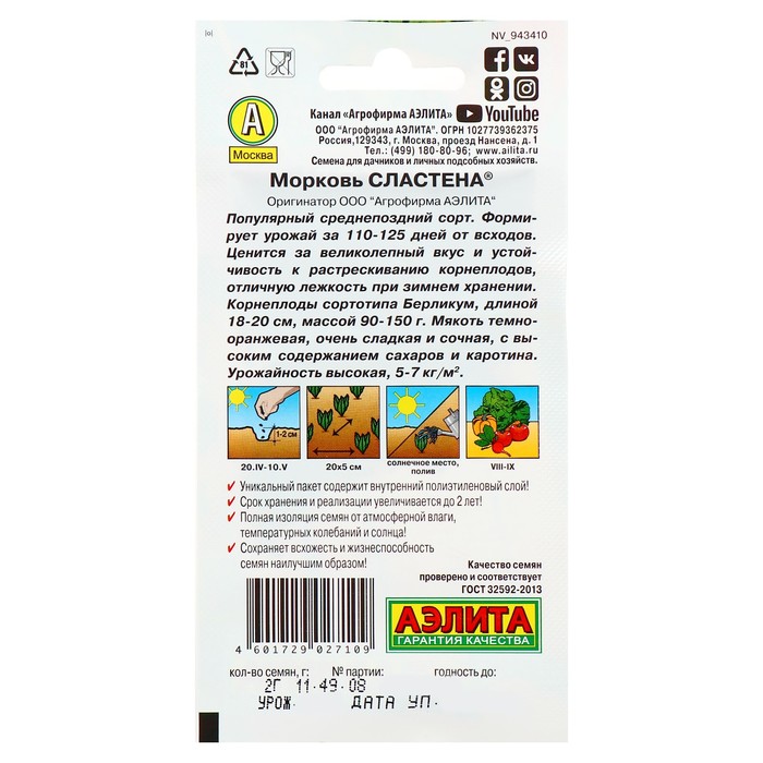 Cреднепоздний сорт. Период от всходов до технической спелости 110-125 дней. Корнеплоды цилиндрические, тупоконечные (сортотип Берликум), длиной 18-20 см, массой 90-150 г. Мякоть оранжевая, очень сладкая и сочная, с высоким содержанием сахаров и каротина. Для использования в свежем виде, консервирования, замораживания, зимнего хранения. Сорт устойчив к цветушности и растрескиванию корнеплодов. Урожайность высокая, 5-7 кг/м2.