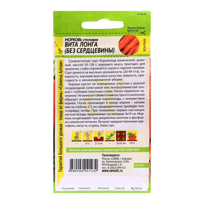Среднеспелый сорт. Урожайность 20-49 т/га. Корнеплод конический, длинный, массой 93-128 г, хорошего вкуса. Корнеплод пригоден для хранения, слабо поражается серой и чёрной гнилями. Сорт ценится за высокую урожайность, товарность, хорошие вкусовые качества, лёжкость, пригодность к механизированной уборке. Хорошо растёт на освещённых участках с рыхлой плодородной супесчаной или легкосуглинистой почвой с глубоким пахотным слоем. Плохо переносит затенение. Не выносит свежего навоза: при его внесении образует искривлённые, с множеством корней корнеплоды. Морковь потребляет мало азота, поэтому её возделывают при умеренном азотном и обильном калийно-фосфорном питании. Лучшие предшественники — картофель, капуста, огурец, томат, лук.