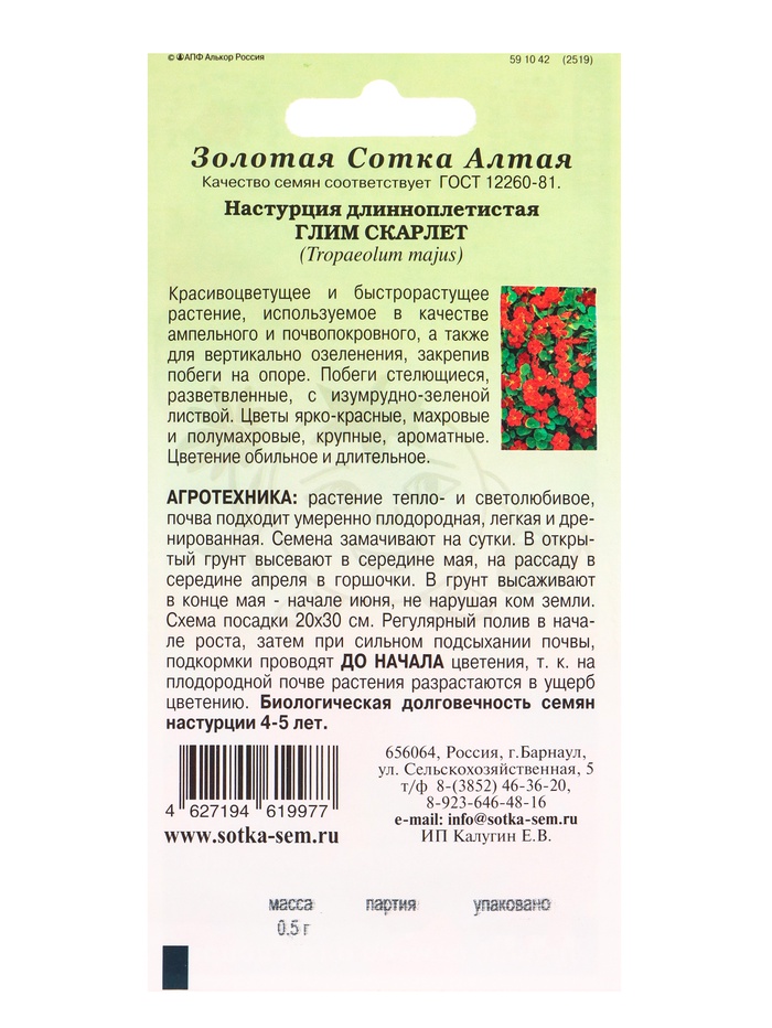 Семена Настурция Глим Скарлет /Сотка/ 0,5г/ h-250см, d-5см/*500