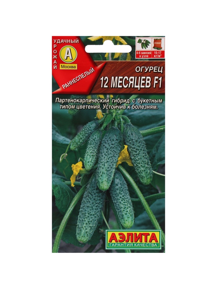Раннеспелый партенокарпический гибрид. Закладывает от 4 до 6 завязей в узле. От всходов до плодоношения 42-45 дней. Растения женского типа цветения. Зеленцы белошипые, короткие, выравненные, долго не перерастают. Вкус отличный, без горечи. Подходят для засолки и консервирования. Гибрид устойчив к ЛМР и МР. Товарная урожайность в открытом грунте – 5-6 кг/м 2 , под пленкой – свыше 15 кг/м2.