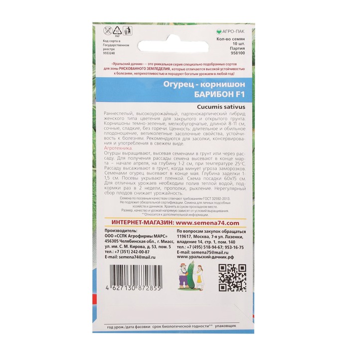 - Семена с отличной всхожестью, проверенного сорта "Барибон", что важно, сорт устойчив к образованию горечи (сладкий), практически не поражается вирусом огуречной мозаики и кладоспориозом.Изумительный раннеспелый, высокоурожайный, партенокарпический гибрид женского типа цветения для закрытого и открытого грунта.