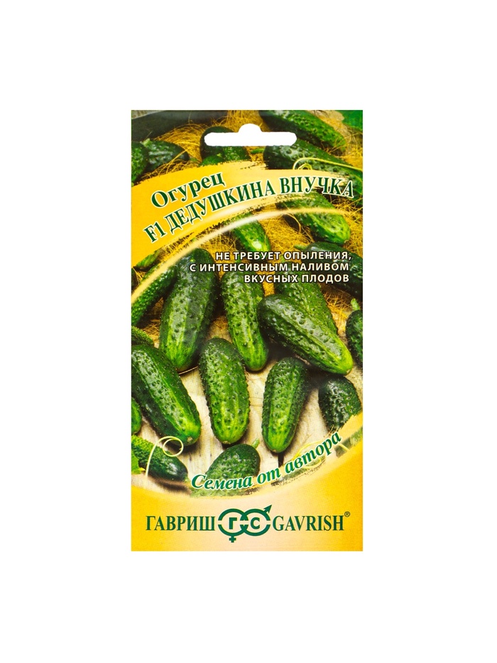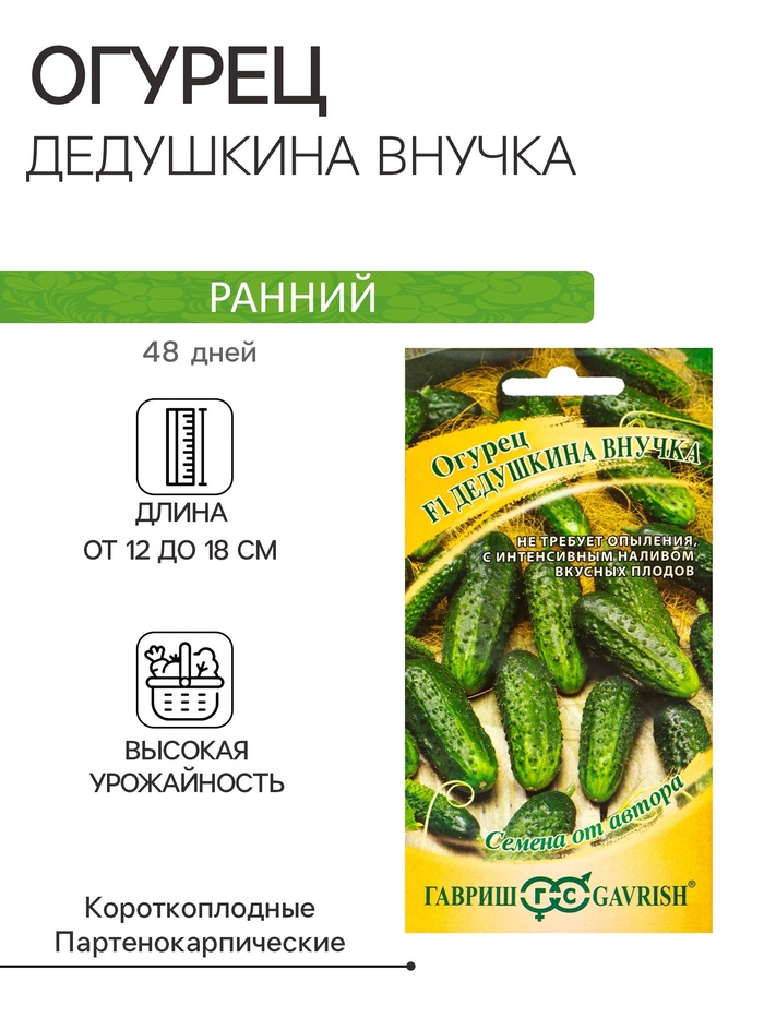 «F1 Дедушкина внучка» — это скороспелый партенокарпический гибрид женского типа цветения с букетным заложением завязей, у которого период от всходов до плодоношения составляет 40–45 дней. Устойчив к настоящей мучнистой росе, оливковой пятнистости, толерантен к ложной мучнистой росе и корневым гнилям. Предназначен для выращивания в открытом и защищённом грунте.