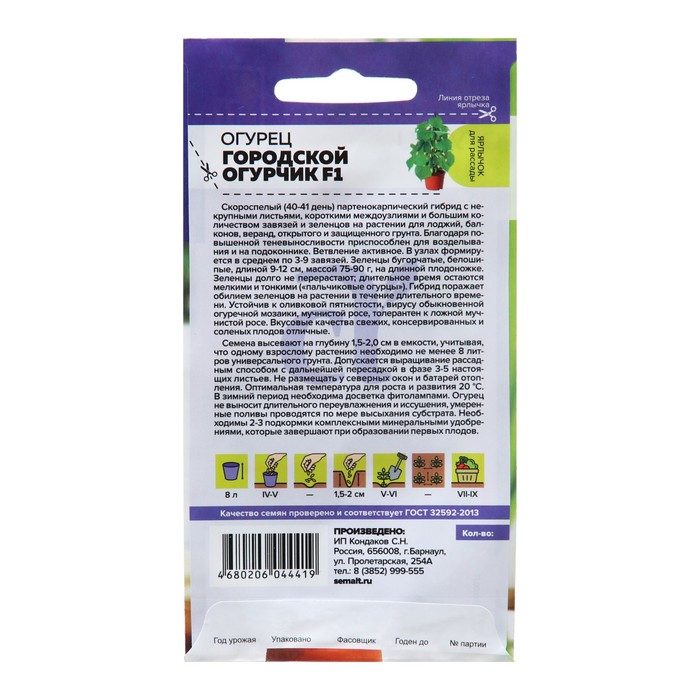 Скороспелый (40-41 день) партенокарпический гибрид с некрупными листьями, короткими междоузлиями и большим количеством завязей и зеленцов на растении для лоджий, балконов, веранд, открытого и защищенного грунта. Благодаря повышенной теневыносливости приспособлен для возделывания и на подоконнике. Ветвление активное. В узлах формируется в среднем по 3-9 завязей. Зеленцы бугорчатые, белошипые, длиной 9-12 см, массой 75-90 г, на длинной плодоножке. Зеленцы долго не перерастают; длительное время остаются мелкими и тонкими («пальчиковые огурцы»). Гибрид поражает обилием зеленцов на растении в течение длительного времени. Устойчив к оливковой пятнистости, вирусу обыкновенной огуречной мозаики, мучнистой росе, толерантен к ложной мучнистой росе. Вкусовые качества свежих, консервированных и соленых плодов отличные.