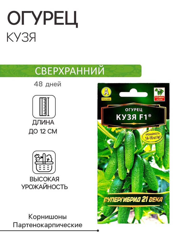 «Кузя» — раннеспелый партенокарпический сорт, который предназначен для выращивания в открытом и защищённом грунте. Это короткий мелкобугорчатый гибрид длиной 5–7 см. Отлично подходит для засолки и консервирования. Обладает высокой устойчивостью к настоящей и ложной мучнистой росе, вирусу огуречной мозаики.