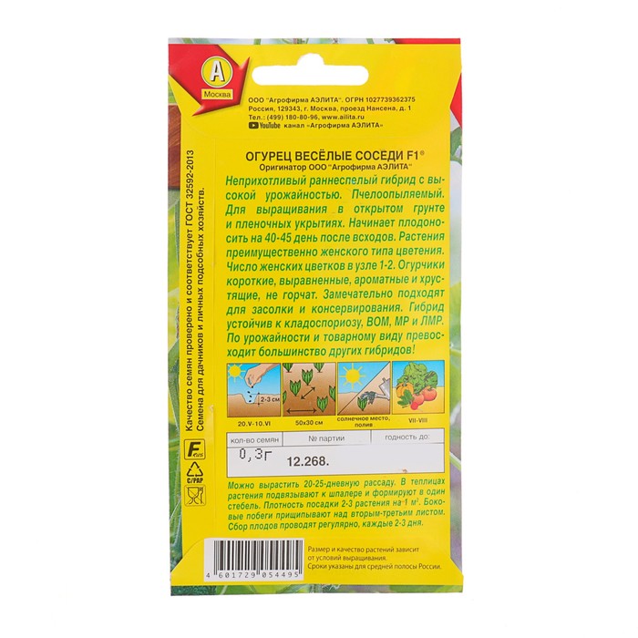 Неприхотливый раннеспелый гибрид с высокой урожайностью. Пчелоопыляемый. Для выращивания в открытом грунте и пленочных укрытиях. Начинает плодоносить на 40-45 день после всходов. Растения преимущественно женского типа цветения. Число женских цветков в узле 1-2. Огурчики короткие, ароматные и хрустящие, не горчат. Замечательно подходят для засолки и консервирования. Гибрид устойчив к кладоспориозу, ВОМ, МР и ЛМР. По урожайности и товарному виду превосходит большинство других гибридов!