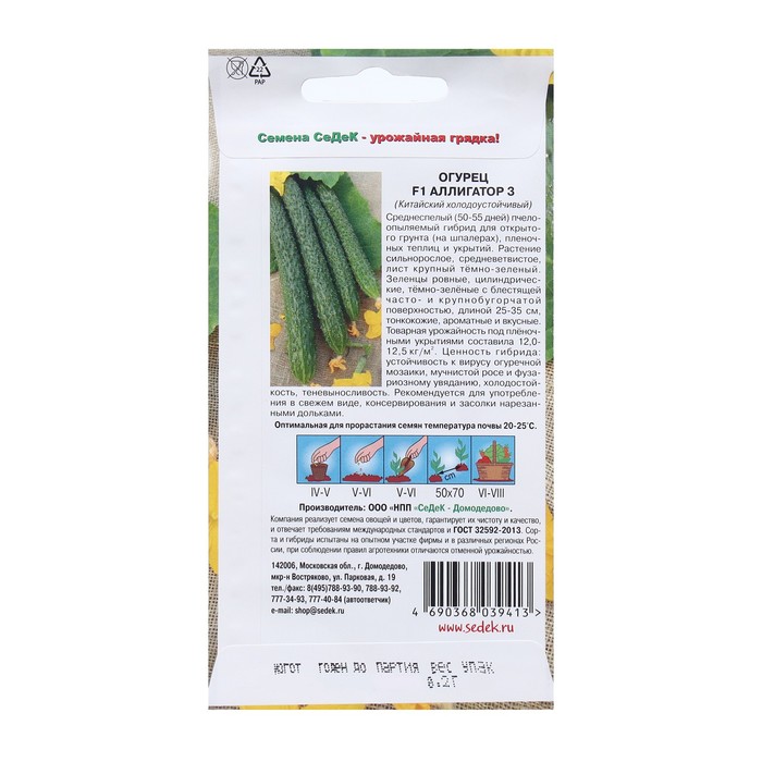 Среднеспелый (50-55 дней) пчелоопыляемый гибрид для открытого грунта (на шпалерах), пленочных теплиц и укрытий. Растение сильнорослое, средневетвистое, лист крупный темно - зеленый. Зеленцы ровные, цилиндрические, тёмно-зелёные с блестящей часто- и крупнобугорчатой поверхностью, длиной 25-35 см, тонкокожие, ароматные и вкусные. Товарная урожайность под плёночными укрытиями составила 12,0-12,5 кг/кв.м. Ценность гибрида: устойчивость к вирусу огуречной мозаики, мучнистой росе и фузариозному увяданию, холодостойкость, теневыносливость. Рекомендуется для употребления в свежем виде, консервирования и засолки нарезанными дольками.