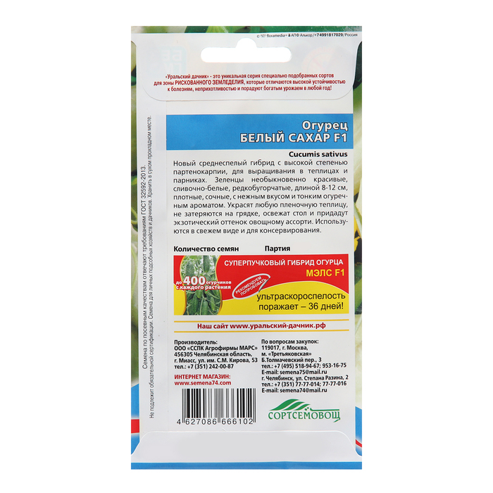 Огурец Белый Сахар F1 - это новый среднеспелый гибрид с высокой степенью партенокарпии, для выращивания в теплицах и парниках. Зеленцы необыкновенно красивые, сливочно-белые, редкобугорчатые, длиной 8-12 см, плотные, сочные, с нежным вкусом и тонким огуречным ароматом.
