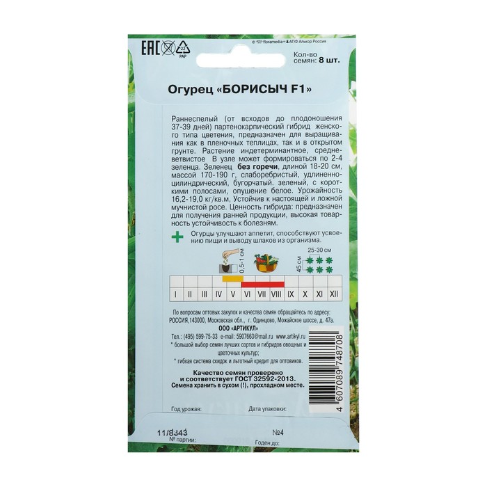 Раннеспелый (от всходов до плодоношения 37-39 дней) партенокарпический гибрид женского типа цветения, предназначен для выращивания как в пленочных теплицах, так и в открытом грунте. Растение индетерминантное, средневетвистое В узле может формироваться по 2-4 зеленца. Зеленец без горечи, длиной 18-20 см, массой 170-190 г, слаборебристый, удлиненно-цилиндрический, бугорчатый. зеленый, с короткими полосами, опушение белое. Урожайность 16,2-19,0 кг/кв.м, Устойчив к настоящей и ложной мучнистой росе. Ценность гибрида: предназначен для получения ранней продукции, высокая товарность устойчивость к болезням.