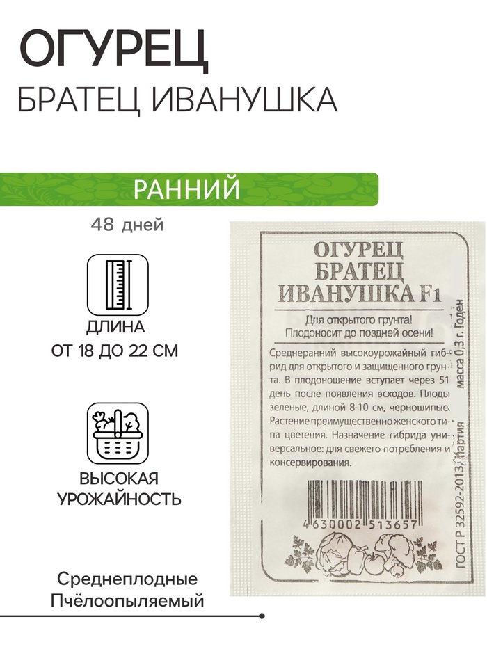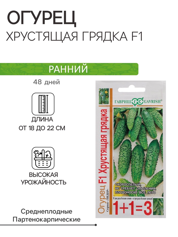 Среднеранний пчелоопыляемый высокоурожайный гибрид для открытого и защищенного грунта. В плодоношение вступает через 51 день после появления всходов. Плоды зеленые, длиной 8-10 см, черношипые. Растение преимущественно женского типа цветения. Назначение гибрида универсальное: для свежего потребления и консервирования. Выращивают прямым посевом семян в грунт и рассадным способом. Семена в открытый грунт высевают, когда почва прогреется до 15-20°С днем и не ниже 8°С ночью. Бороздки или лунки поливают, заделывают в них семена на глубину 1,5-2,0 см и накрывают пленкой. В остекленные или пленочные теплицы, тоннели с начала мая высевают семена или с середины мая высаживают 20-25-дневную рассаду, имеющую 3-5 настоящих листьев. Схема посадки 70х40 см. Растение прищипывают над 5-7 листом. Плоды формируются на боковых побегах.