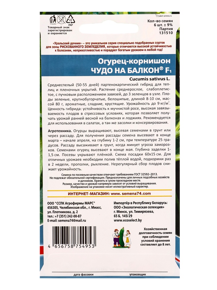 Семена Огурец Чудо на балкон F1 /в реестре Л95/ (УД) Е/П , Е/П, 6 шт.