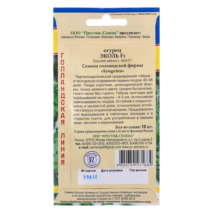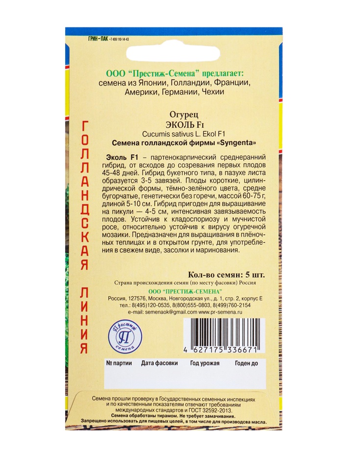 Партенокарпический среднеранний гибрид - от всходов до созревания первых плодов 45-48 дней. Плоды короткие, цилиндрической формы, тёмно-зеленого цвета, средне бугорчатые, генетически без горечи. Гибрид пригоден для выращивание на пикули – 4-5 см, интенсивная завязываемость плодов. Устойчив к кладоспориозу и мучнистой росе, относительно устойчив к вирусу огуречной мозаики. Предназначен для выращивания в плёночных теплицах и в открытом грунте, для употребления в свежем виде, засолки и маринования.