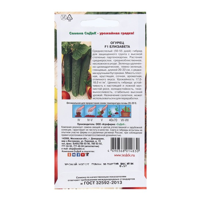 Среднеспелый (50-55 дней) гибрид для защищенного грунта с высокой степенью партенокарпии. Растение среднерослое, среднеоблиственное, не сложное в уходе. Зеленцы удлиненно-цилиндрические, темно-зеленые, глянцевые, длиной 20-22 см, с редкими крупными бугорками. Мякоть плотная, хрустящая, сочная, ароматная, отличного вкуса. Урожайность 17,0-18,0 кг/м². Ценность гибрида: устойчивость к настоящей и ложной мучнистой росе, холодостойкость, теневыносливость, стабильно высокий урожай. Назначение салатное, может использоваться и для переработки.