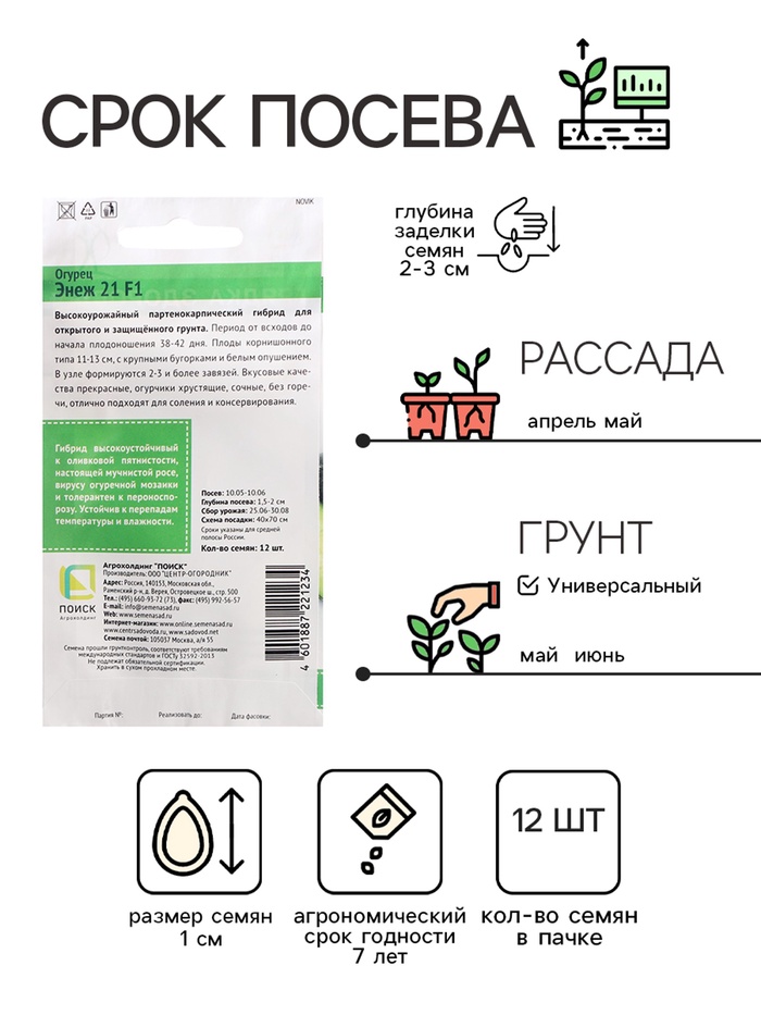 Высокоурожайный партенокарпический гибрид для открытого и защищённого грунта. Период от всходов до начала плодоношения 38-42 дня. Плоды корнишонного типа 11-13 см, скрупными бугорками и белым опушением. В узле формируются 2-3 и более завязей. Вкусовые качества прекрасные, огурчики хрустящие, сочные, без горечи, отлично подходят для соления и консервирования.