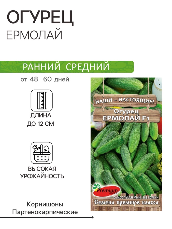 «Ермолай» — это раннеспелый самоопыляемый высокоурожайный гибрид для открытого грунта, стеклянных и плёночных теплиц. Растение украшают короткие цилиндрические мелкобугорчатые корнишоны длиной 8–10 см. Отличительная особенность сорта — огурцы очень быстро нарастают после очередного сбора. Хорошо подходят для засолки и консервирования, устойчивы к перепадам температуры.