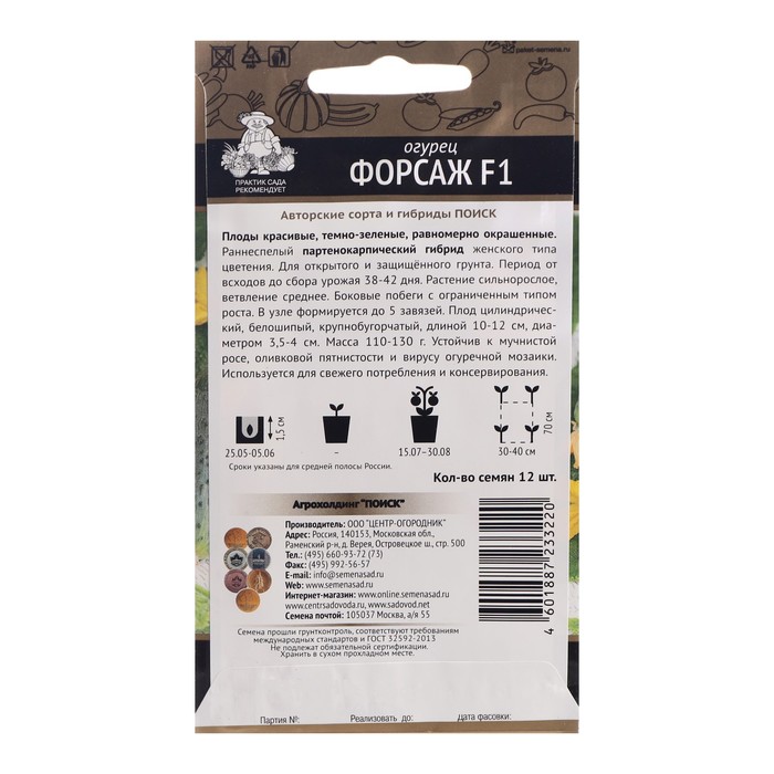 Плоды красивые, темно-зеленые, равномерно окрашенные. Раннеспелый партенокарпический гибрид женского типа цветения. Для открытого и защищённого грунта. Период от всходов до сбора урожая 38-42 дня. Растение сильнорослое, ветвление среднее. Боковые побеги с ограниченным типом роста. В узле формируется до 5 завязей. Плод цилиндрический, белошипый, крупнобугорчатый, длиной 10-12 см, диаметром 3,5-4 см. Масса 110-130 г. Устойчив к мучнистой росе, оливковой пятнистости и вирусу огуречной мозаики. Используется для свежего потребления и консервирования.