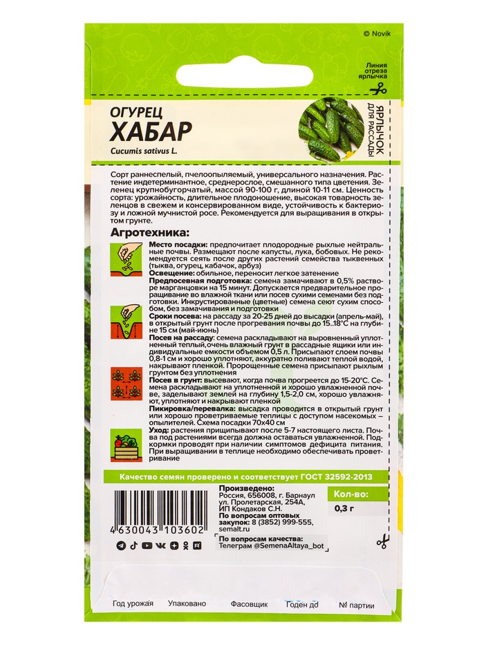 Семена Огурец «Хабар», 0.3 г, «Семена Алтая»
