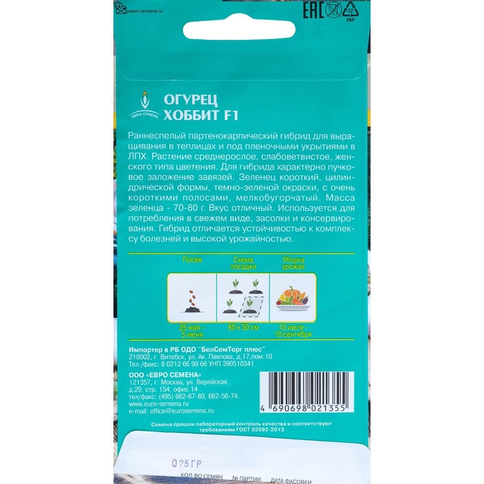 Раннеспелый партенокарпический гибрид для выращивания в теплицах и под пленочными укрытиями в ЛПХ. Растение среднерослое, слабоветвистое, женского типа цветения. Для гибрида характерно пучковое заложение завязей. Зеленец короткий, цилиндрической формы, темно-зеленой окраски, с очень короткими полосами, мелкобугорчатый. Масса зеленца - 70-80 г. Вкус отличный. Используется для потребления в свежем виде, засолки и консервирования. Гибрид отличается устойчивостью к комплексу болезней и высокой урожайностью.