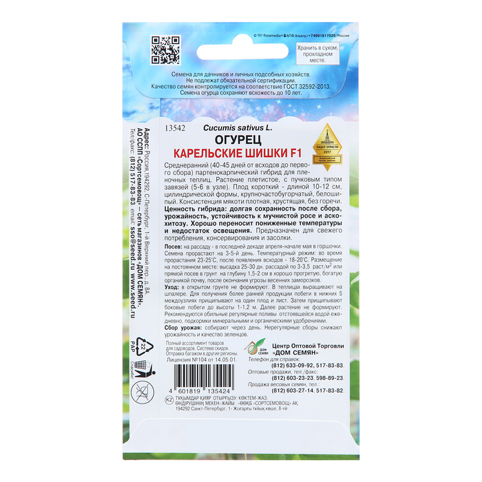 Среднеранний - 55-60 дней от посева до первых сборов в зимних теплицах, 40-45 дней в весенне-летний оборот, партенокарпический (не требует опыления) гибрид. Завязь букетная - в каждой пазухе 5-6 завязей. Плод короткий - длиной 10-12 см, цилиндрической формы, крупнобугорчатый, расположение бугорков частое, шипы белого цвета. Консистенция мякоти плотная, хрустящая. Обладает хорошей транспортабельностью, после сбора долго не вянет. Пригоден для засолки и консервирования. Толерантен к мучнистой росе и аскохитозу. Для регионов с прохладным климатом необходим рассадный способ выращивания. Семена высевают в горшочки диаметром 10 см. со специально подготовленной почвой (2 части перегноя, 1 часть дерновой земли, 1 часть песка) на глубину 1,5 см. Температура воздуха и почвы должна быть 20-23°С. Грунт равномерно увлажняют (не допускается перелив и закисание почвы). После появления всходов, в процессе роста растений, не допускать снижение температуры ниже 14°С. Сделать 1-2 подкормки полным минеральным удобрением с преобладанием азота. Рассада высаживается, когда минует угроза заморозков.