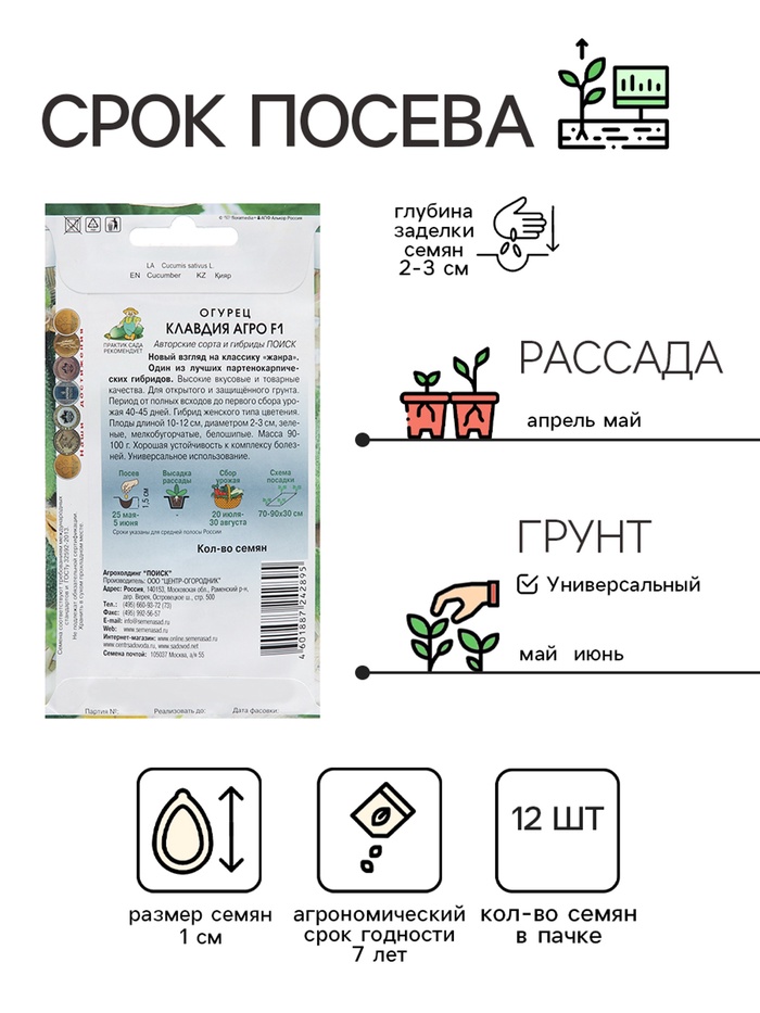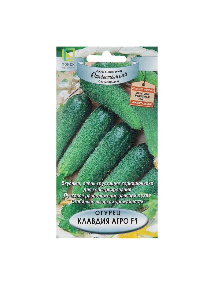 Огурец Клавдия Агро F1 - новый взгляд на классику «жанра». Один из лучших партенокарпических гибридов. Высокие вкусовые и товарные качества. Вкусные, очень хрустящие корнишончики для консервирования Пучковое расположение завязей в узле Стабильно высокая урожайность Для открытого и защищённого грунта. Период от полных всходов до первого сбора урожая 40-45 дней. Гибрид женского типа цветения. Плоды длиной 10-12 см, диаметром 2-3 см, зеленые, мелкобугорчатые, белошипые. Масса 90-100 г. Хорошая устойчивость к комплексу болезней. Универсальное использование.