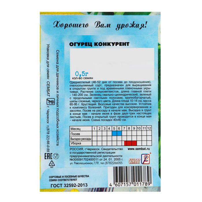 Раннеспелый пчелоопыляемый сорт для выращивания в открытом грунте и под временными пленочными укрытиями. Растение сильноветвистое, длина главной плети достигает 2м. Огурчики имеют правильную овально-цилиндрическую форму, зеленого цвета с продольными светлыми полосами, хрустящие, длина плода 10-14см, диаметр 3,5-5см, масса плода 70-100г. Поверхность огурца крупно-бугорчатая, опушение черное (редкое). Хрустящие плотные плоды не имеют горького вкуса, поэтому идеально подходят как для употребления в свежем виде и приготовления салатов, так и для засолки.