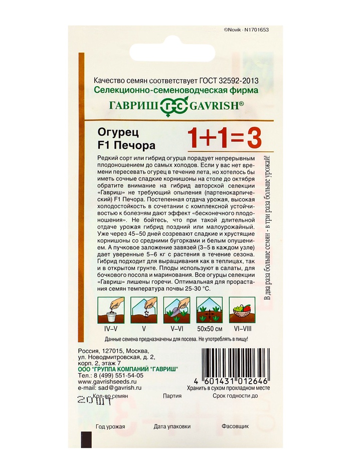 Скороспелый (45-48 день от всходов до плодоношения) партенокарпический гибрид женского типа цветения. Предназначен для выращивания в открытом грунте и пленочных теплицах. Посев на рассаду в конце апреля. Высадка в грунт в конце мая - начале июня в фазе 3-4-х настоящих листьев. Посев непосредственно в грунт - в серединеконце мая. Схема посадки 50х50 см. Зеленец длиной 11-13 см, массой 100-120 г, бугорчатый, бурошипый, без горечи. В пазухе листа образуется до 3-4-х завязей. Использование плодов универсальное (в свежем виде, засолка, маринование). Гибрид холодостойкий, обладает комплексной устойчивостью к основным заболеваниям огурца. Плодоносит до самых холодов. Урожайность одного растения 5,5-6,5 кг.