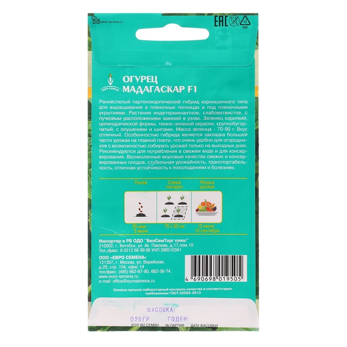 Огурец «Мадагаскар» — раннеспелый партенокарпический сорт, предназначенный для выращивания в плёночных теплицах и укрытиях. Короткий цилиндрический корнеплод массой 70–90 г обладает отличным вкусом и комплексной устойчивостью к болезням и заморозкам. Прекрасно подходит для употребления в свежем виде и консервирования.