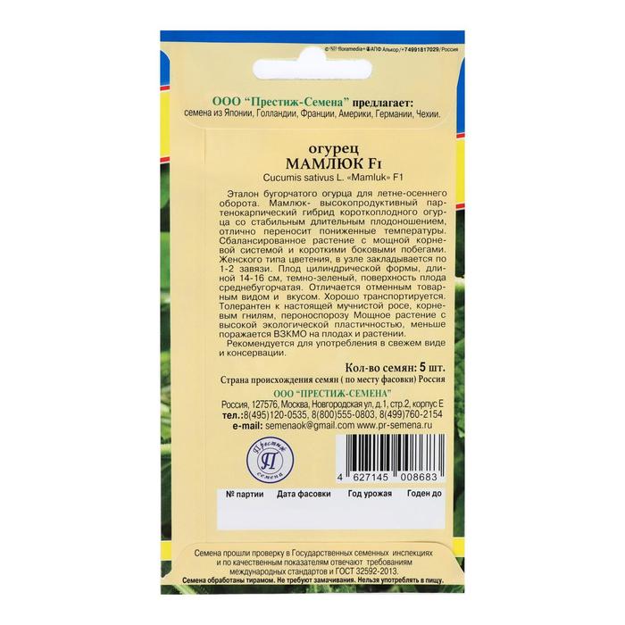 Эталон бугорчатого огурца для летне-осеннего оборота. Мамлюк- высокопродуктивный партенокарпический гибрид короткоплодного огурца со стабильным длительным плодоношением, отлично переносит пониженные температуры. Сбалансированное растение с мощной корневой системой и короткими боковыми побегами. Женского типа цветения, в узле закладывается по 1-2 завязи. Плод цилиндрической формы, длиной 14-16 см, темно-зеленый, поверхность плода среднебугорчатая. Отличается отменным товарным видом и вкусом. Хорошо транспортируется. Толерантен к настоящей мучнистой росе, корневым гнилям, пероноспорозу Мощное растение с высокой экологической пластичностью, меньше поражается ВЗКМО на плодах и растении. Рекомендуется для употребления в свежем виде и консервации.
