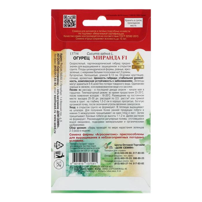 Раннеспелый (42-47 дней от всходов до начала плодоношения), партенокарпический гибрид для выращивания в защищенном и открытом грунте. Плоды цилиндрической формы, ровные, ярко-зеленые, с неяркими белыми полосками на1/3 длины, слабобугорчатые, белошипые, длиной 9-13 см. Огурчики хрустящие, сочные, ароматные. Ценность гибрида: стабильная урожайность, комплексная устойчивость к заболеваниям. Зеленцы могут храниться 5-6 дн. без потери товарного вида. Одинаково хороши в свежем, консервированном виде и в баночной засолке. Гибриды огурцов агрофирмы «Агросемтомс» отлично адаптированы к неблагоприятным факторам севера.