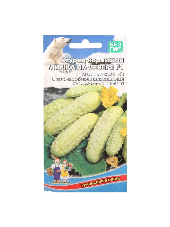 Гибрид Мишка-на-севере F1, среднеспелый (48-50 дней от посева до первых сборов), пчелоопыляемый. Плод короткий - длиной 10-12 см, цилиндрической формы, крупнобугорчатый, снежно-белого цвета. Консистенция мякоти плотная, хрустящая. Для регионов с прохладным климатом необходим рассадный способ выращивания. Семена высевают в торфяные горшочки диаметром 10 см со специально подготовленной почвой (2 части перегноя, 1 часть дерновой земли, 1 часть песка) на глубину 1,5 см. Температура воздуха и почвы должна быть 20-23°С. Грунт равномерно увлажняют (не допускается перелив и закисание почвы). После появления всходов, в процессе роста растений, не допускать снижение температуры ниже 14°С. Сделать 1-2 подкормки полным минеральным удобрением с преобладанием азота. Рассада высаживается, когда минует угроза заморозков.