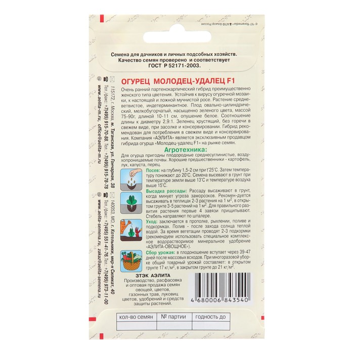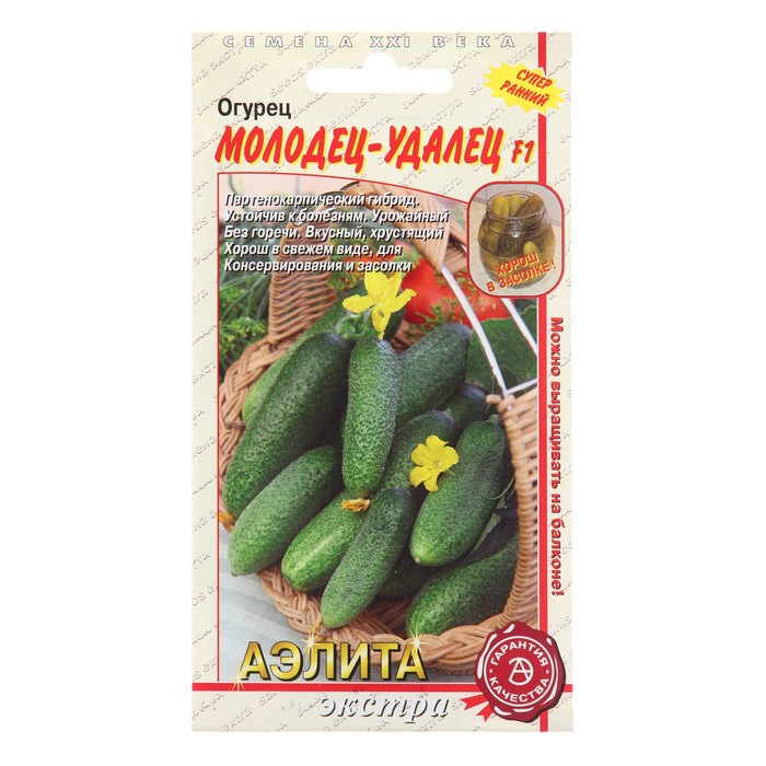 Растение среднерослое, длина главного стебля 2.5-3м, ветвление среднее. Зеленец зеленый, среднебугорчатый, опушение редкое, солжное, белое, диной 9-11 см, массой 90-115г, генетически без горечи. Вкусовые и засолочные качества высокие. Рекомендуется для выращивания в открытом грунте и пленочных теплицах.