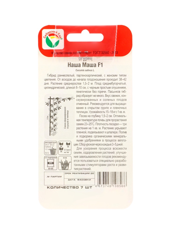 «Наша Маша» — это раннеспелый высокоурожайный сорт, техническая спелость которого наступает через 39–43 дня. Гибрид предназначен для выращивания в плёночных теплицах и открытом грунте. На каждом узле образуется по 2–3 завязи с цилиндрическими бугорчатыми корнишонами длиной 8–10 см и массой 70–75 г. Огурцы отлично подходят для употребления в свежем виде, консервирования и засолки.