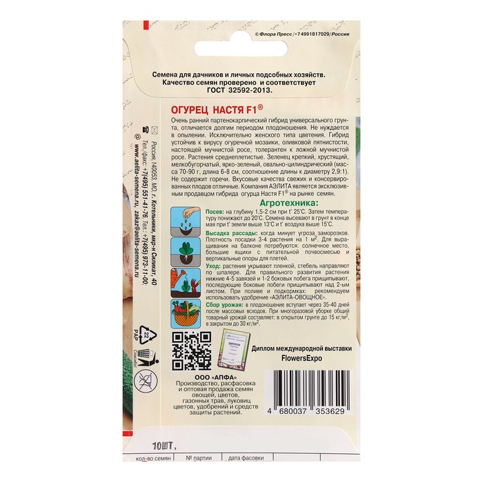 Очень ранний самоопыляемый партенокарпический гибрид для открытого грунта, пленочных и стеклянных теплиц. Отличительные свойства: увеличенный период плодоношения, высокая урожайность и товарность плодов. Устойчив к основным болезням огурца: вирусу огуречной мозаики, настоящей мучнистой росе, оливковой пятнистости, толерантен к ложной мучнистой росе. Растение среднеплетистое. Зеленец крепкий, хрустящий, мелко-бугорчатый, с белым, плотным опушением, овально-цилиндрический, ярко-зелёный. Масса зеленца 80-86 г, длина 6,0-8,0 см, соотношение длины к диаметру 3,0:1. Не содержит горечи. Отличные вкусовые качества в свежем виде, при консервировании и засолке.