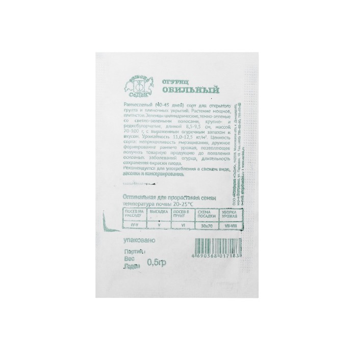 Раннеспелый (43-48 дней от всходов до плодоношения), пчелоопыляемый, консервный сорт. Рекомендуется для выращивания в открытом грунте. Посев на рассаду в начале мая. Высадка в грунт в конце мая – начале июня в фазе 2-3-х настоящих листьев. Посев непосредственно в грунт – в конце мая. Схема посадки 40х40 см. Растение плетистое, сильнооблиственное, смешанного типа цветения. Лист темно-зеленый, среднерассеченный, среднеморщинистый. Зеленец цилиндрический, крупнобугорчатый (бугорки редкие), сильноребристый, темно-зеленый с резковыраженными светло-зелеными полосами, на поперечном разрезе округло-трехгранный, опушение белое. Длина зеленца 8,7-9,3 см, диаметр 2,7-3,0 см. Масса зеленца 70-102 г. Вкусовые качества отличные. Сорт дружно формирует урожай. Раннеспелость, дружность формирования урожая и интенсивность плодоношения сорта позволяют получить урожай товарной продукции до появления заболевания - ложной мучнистой. Урожайность 2,2-3,0кг/растение