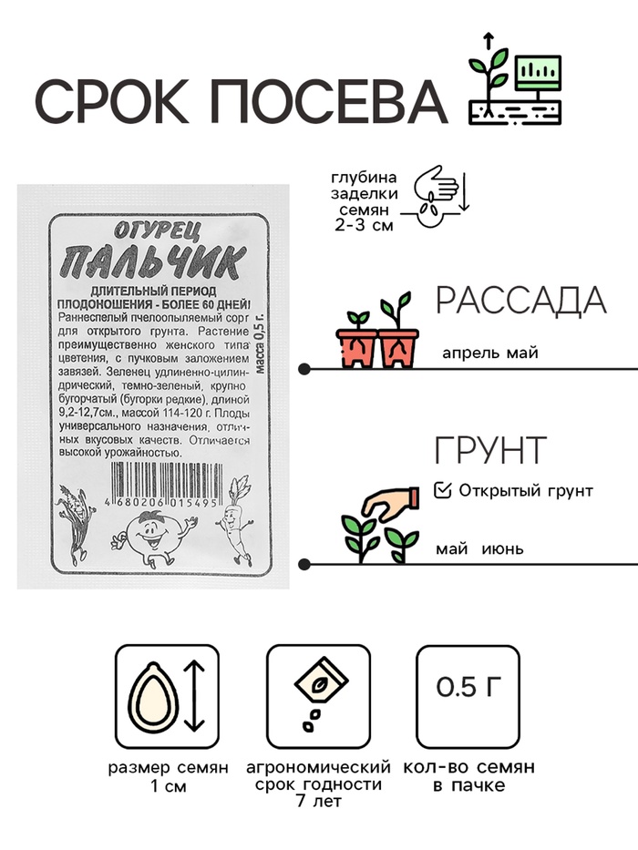 Раннеспелый пчелоопыляемый сорт для открытого грунта. Растение преимущественно женского типа цветения, с пучковым заложением завязей. Зеленец удлиненно-цилиндрический, темно-зеленый, крупно-бугорчатый (бугорки редкие), длиной 9,2-12,7 см, массой 114-120 г плоды универсального назначения, отличных вкусовых качеств. Отличается длительным периодом плодоношения - более 60 дней и высокой урожайностью. Схема формирования растения с пучковой завязью: 0 ЗОНА. В пазухах первых 3-4 листьев выщипывают зачатки побегов и завязей, не трогая самих листьев. 1 ЗОНА. В 3-4 узлах выщипывают зачатки боковых побегов, оставляя завязи. 2 ЗОНА. В 3-4 узлах боковые побеги оставляют, удаляют точку роста после 1-го листа. Все завязи оставляют. 3 ЗОНА. Оставляют боковые побеги, ограничивая их рост после 2 листа. 4 ЗОНА. Главный стебель прищипывают, когда он достигнет соседнего растения. Все боковые побеги удаляют.