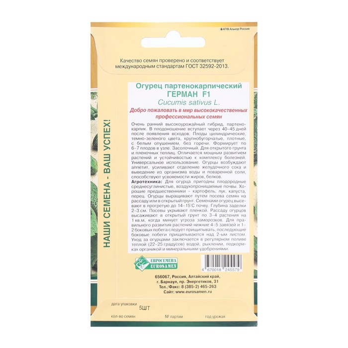 Гибрид ранний, средневетвистый, партенокарпический, исключительно женского типа цветения. От всходов до начала плодоношения 40-43 дня. При благоприятных условиях в узле формирует по 4-7 завязей. Плоды цилиндрической формы, темно-зелёные, крупнобугорчатые, белошипые, массой 80-100 г. Огурцы генетически без горечи, плотной консистенции, с высокими товарными качествами и транспортабельностью. Обладает отличными вкусовыми качествами как в свежем, так и в консервированном виде. Гибрид устойчив к кладоспориозу, вирусу обыкновенной огуречной мозаики, мучнистой росе и оливковой пятнистости. Рекомендуется для открытого грунта и пленочных теплиц. Плотность посадки 3-4 растения/м². Урожайность в открытом – 12,0-14,0 кг/м², в защищённом грунте свыше 20 кг/м².
