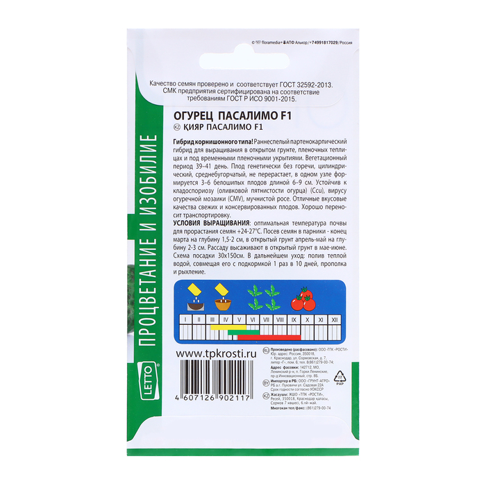 Гибрид корнишонного типа. Раннеспелый партенокарпический гибрид для выращивания в открытом грунте, пленочных теплицах и под временными пленочными укрытиями. Вегетационный период 39–41 день. Плод генетически без горечи, цилиндрический, среднебугорчатый, не перерастает, в одном узле формируется 3–6 белошипых плодов длиной 6–9 см. Устойчив к кладоспориозу (оливковой пятнистости огурца) (Ccu), вирусу огуречной мозаики (CMV), мучнистой росе. Отличные вкусовые качества свежих и консервированных плодов. Хорошо переносит транспортировку. УСЛОВИЯ ВЫРАЩИВАНИЯ: оптимальная температура почвы для прорастания семян +24-27°С. Посев семян в парники - конец марта на глубину 1,5-2 см, в открытый грунт апрель-май на глубину 2-3 см. Рассаду высаживают в открытый грунт в мае-июне. Схема посадки 30x150 см. В дальнейшем уход: полив теплой водой, совмещая его с подкормкой 1 раз в 10 дней, прополка и рыхление. Семена обработаны тирамом .