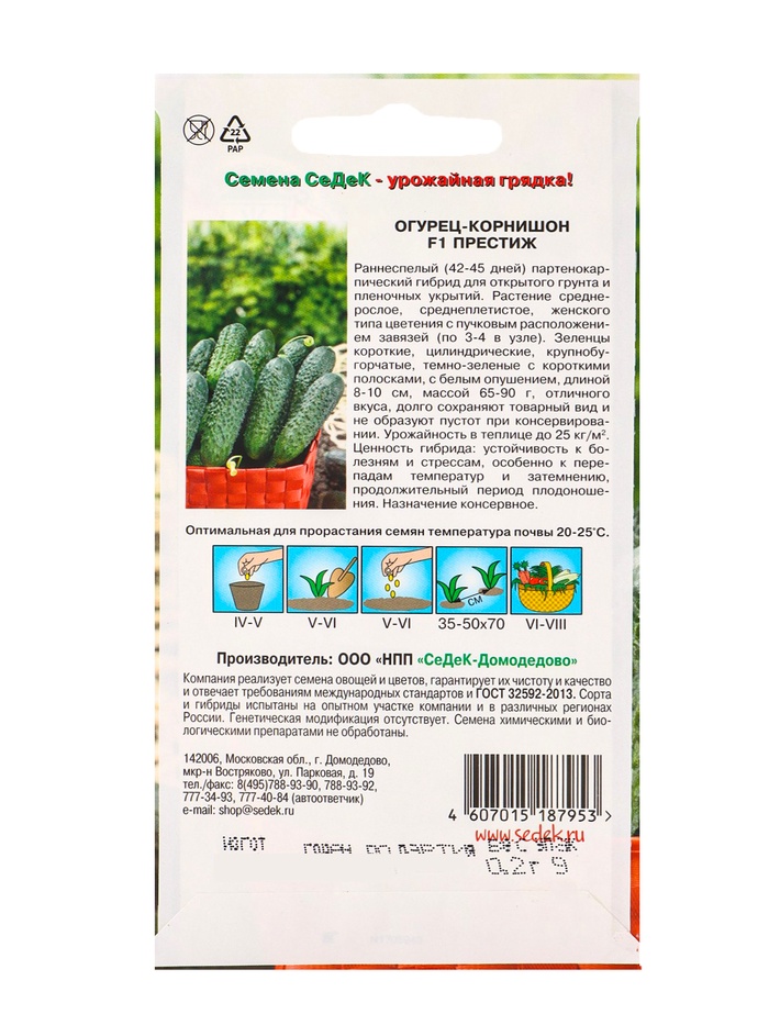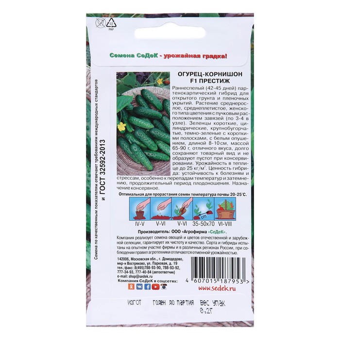 Раннеспелый (42-45 дней) партенокарпический гибрид для открытого грунта и пленочных укрытий. Растение среднерослое, среднеплетистое, женского типа цветения с пучковым расположение завязей (по 3-4 в узле). Зеленцы короткие, цилиндрические, крупнобугорчатые, темно-зеленые с короткими полосками, с белым опушением, длиной 8-10 см, массой 65-90 г, отличного вкуса, долго сохраняют товарный вид и не образуют пустот при консервировании. Урожайность в теплице до 25 кг/м². Ценность гибрида: устойчивость к болезням и стрессам, особенно к перепадам температур и затемнению, продолжительный период плодоношения. Назначение консервное.